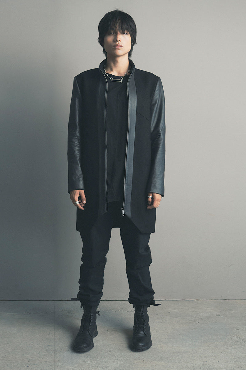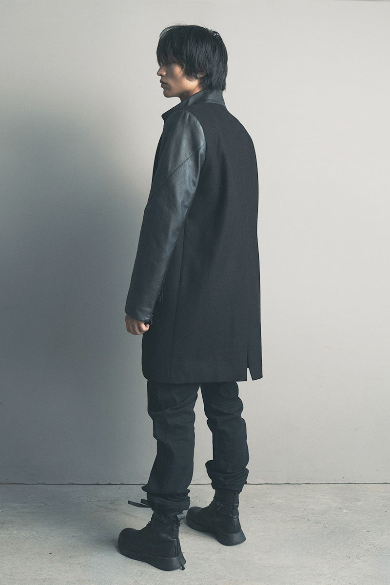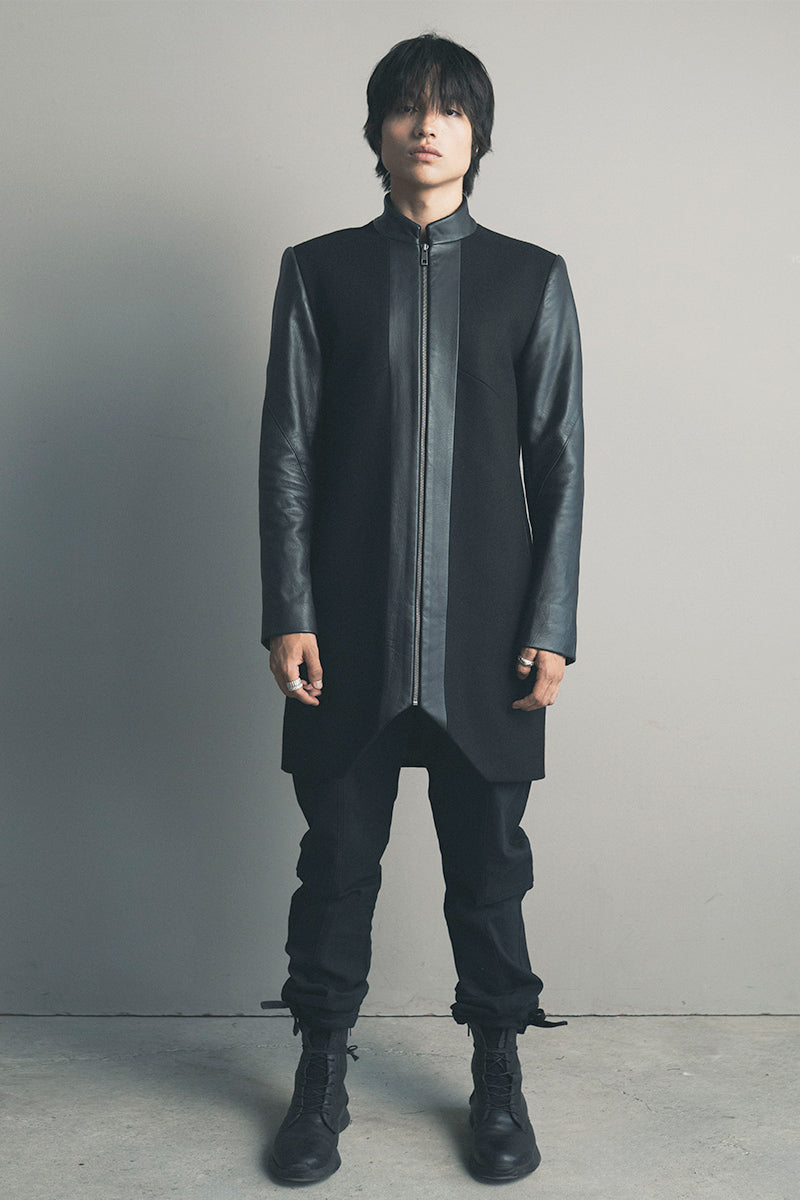Abrigo que combina la calides de paño y la fuerza del cuero en una propuesta vanguardista, ideal para ciudades frias.