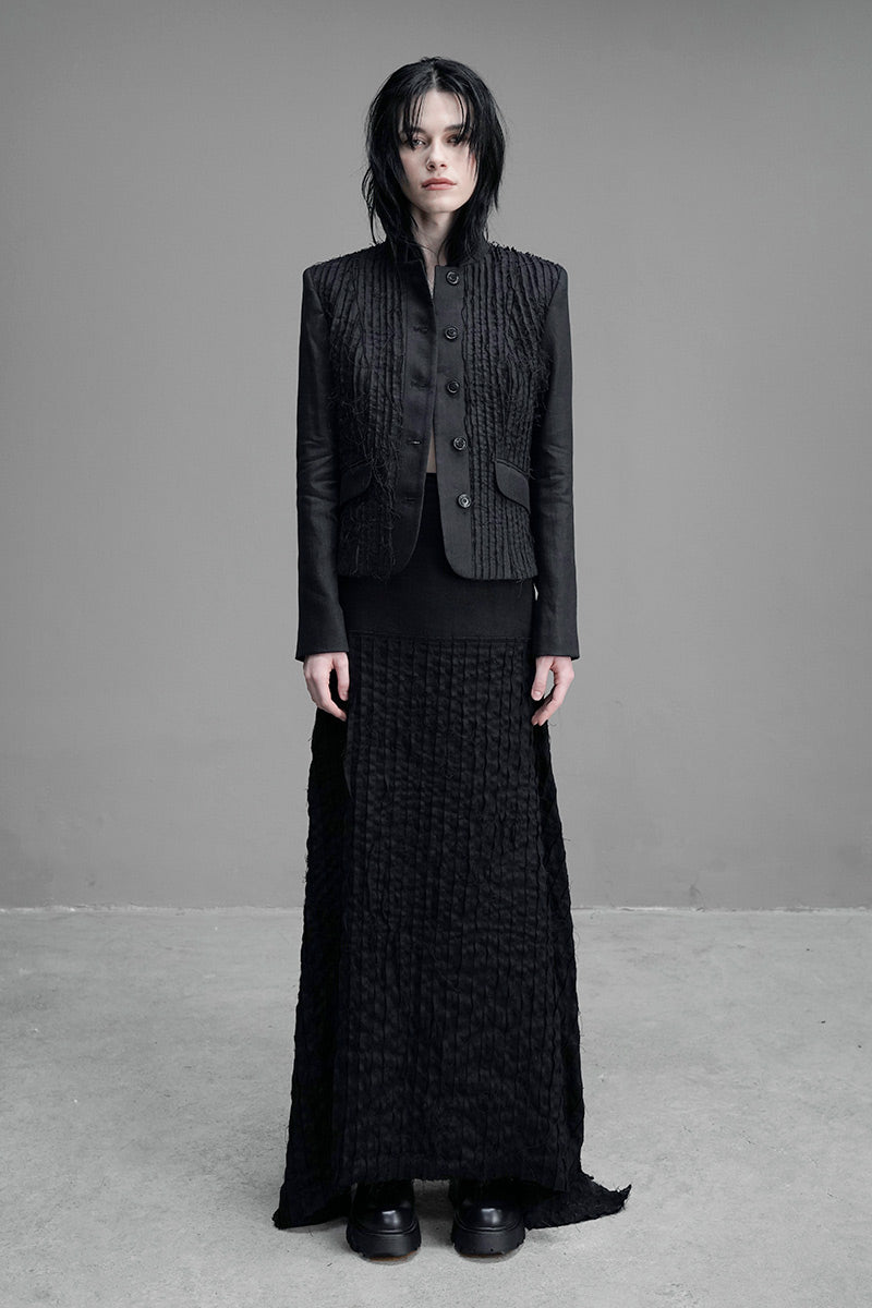 Prenda construida en textil de lino, doble capa texturizada.
