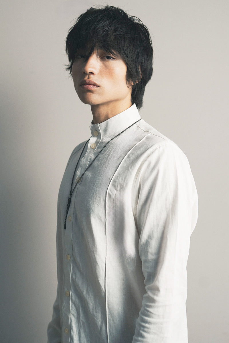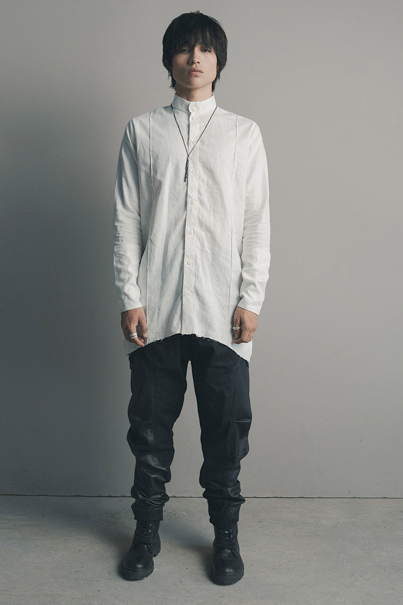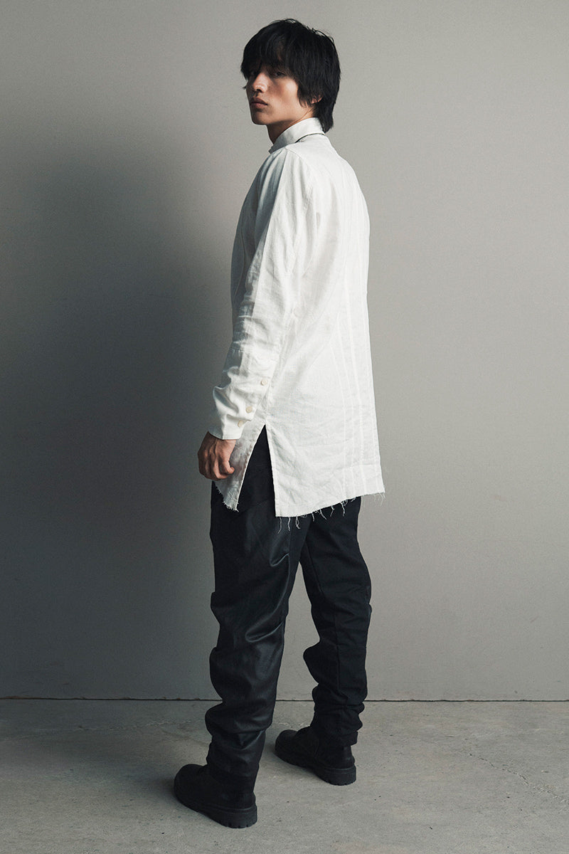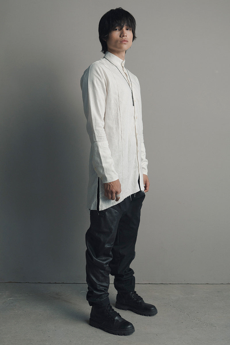 Una propuesta de diseño sobre una prenda que normalmete se rige por cortes convencionales, esta vez con un patronaje asimetrico y un material noble como el lino.