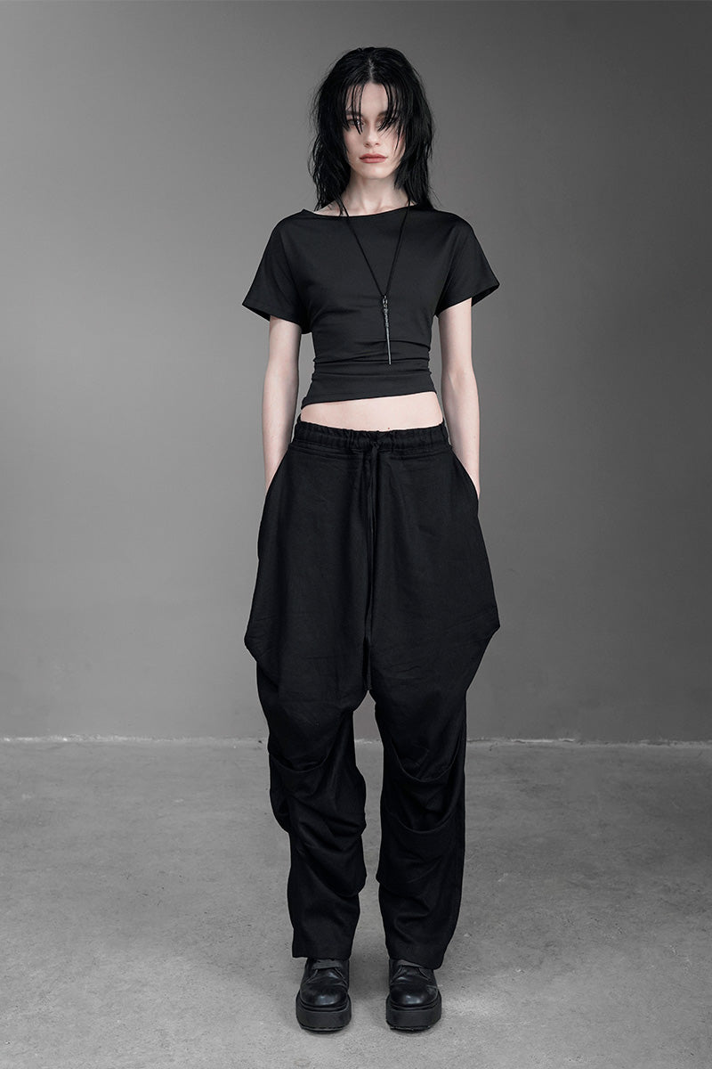 Prenda construida en textil lino en color negro con técnica de drapeado.