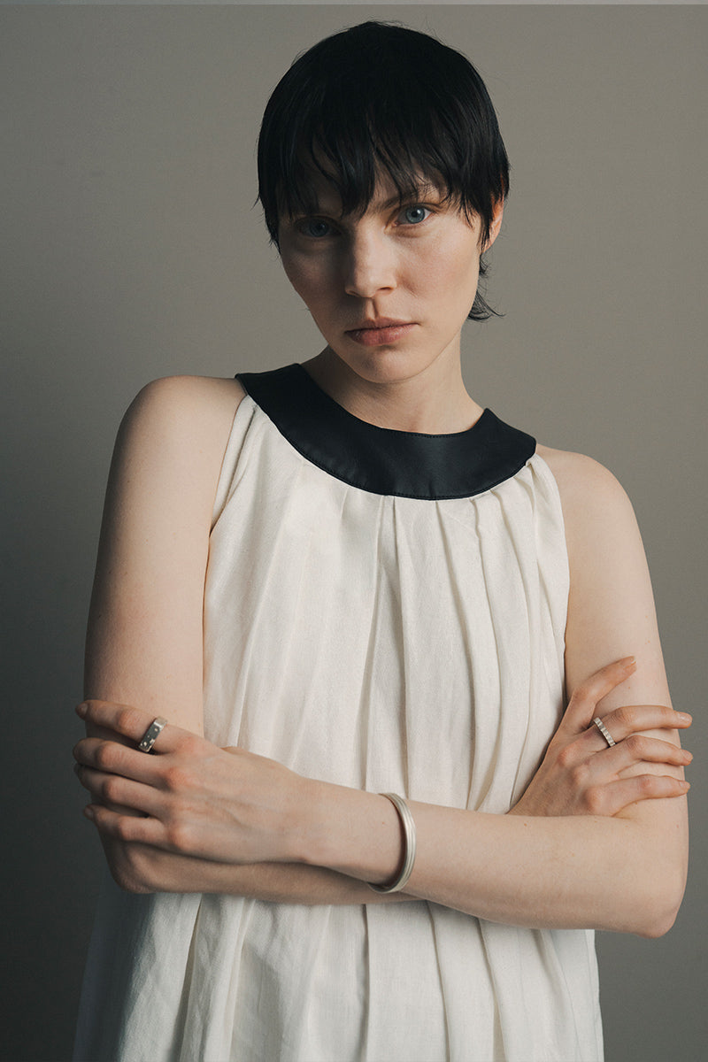 Conectado de manera armoniosa el blanco y el negro, la fluidez y la delicadeza de los materiales, creamos una propuesta de vestido que rompe los limites y permite ser llevado en diferentes climas y ocasiones de uso.